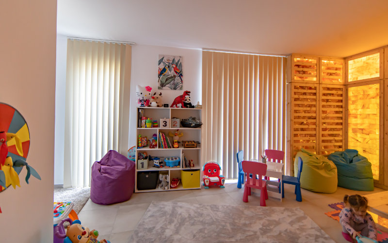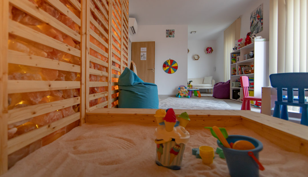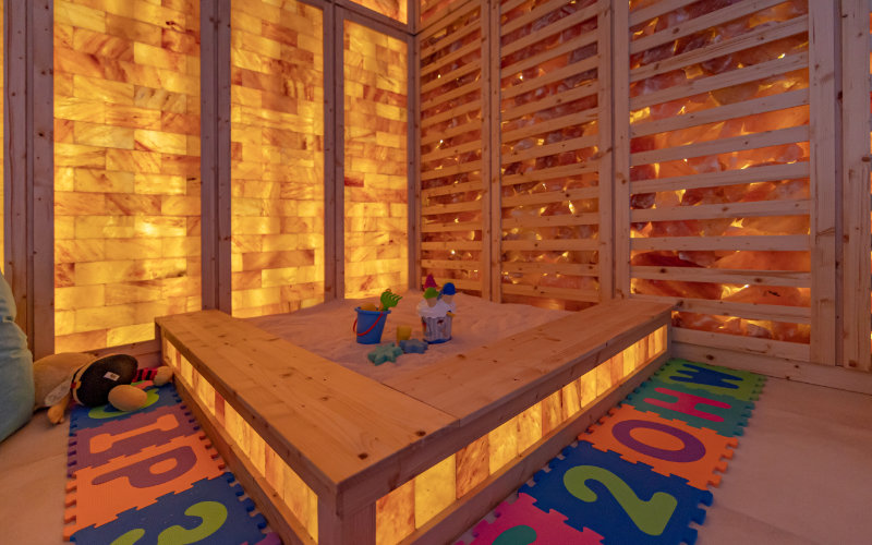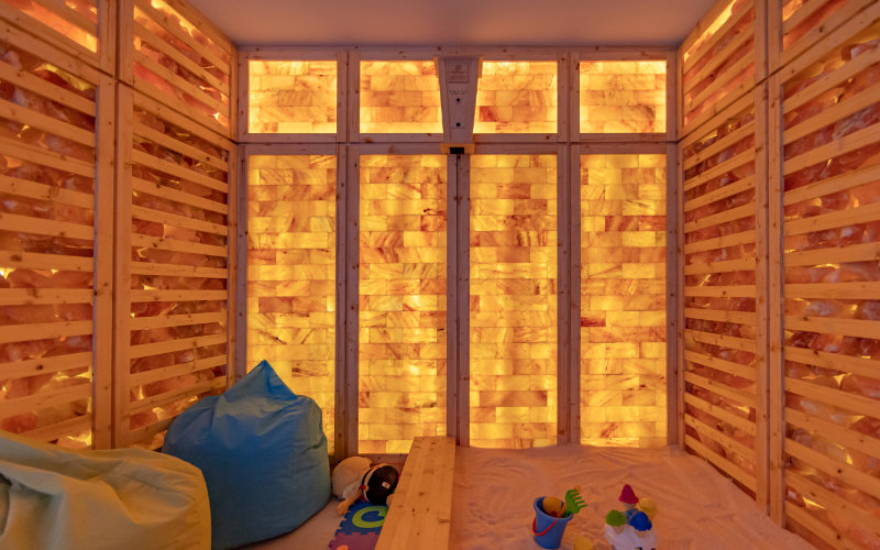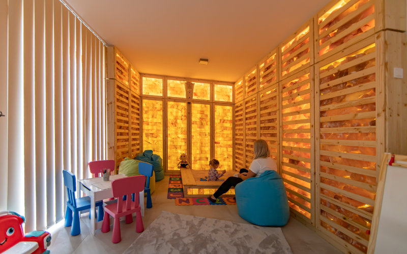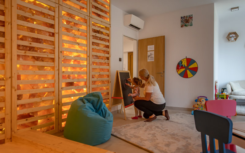Kisgyerekes szülők számára nyújt ideális megoldást a sószoba. Itt a vendégek kellemes, otthoni nappalihoz hasonló környezetben tölthetik el a kezelések idejét. A sószobában Himalájai kristálysó téglák találhatóak, a hőmérséklet 20-22 C°.